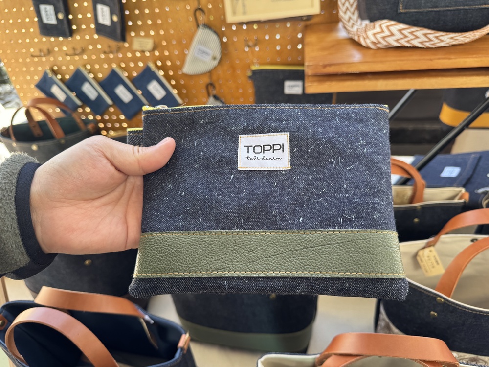 岡山県のデニムブランド「TABI×DENIM」のブースには、デニム特有の丈夫さと、こだわりが詰まったシンプルなバッグが並んでいました。