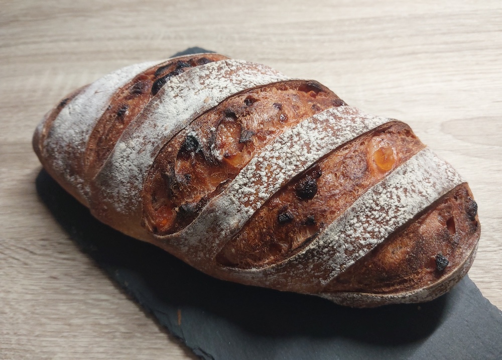 自家製酵母のカンパーニュ生地にラズベリーソースを練り込み、レーズン・クランベリー・パパイヤ・パイナップルの白ワイン漬けとホワイトチョコを混ぜ込んだ、鮮やかな色合いのパンです。