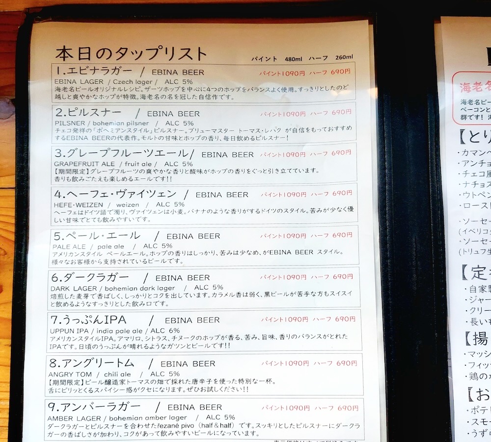 エビナラガーは、すっきりとしたキレのある飲み口で、最初の一口からビールの香りとコクが広がり、クラフトビールの魅力を存分に感じられる一杯でした。