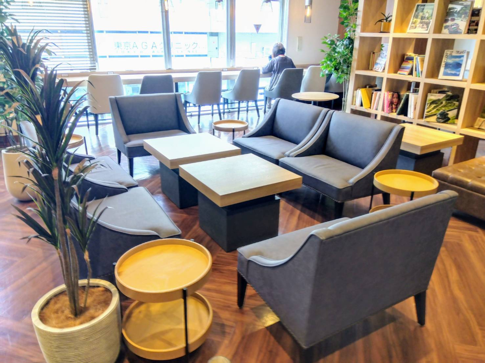 「望星薬局」の隣にあるエレベーターで3階に上がると、ロビーとカフェフロアが見えてきます。