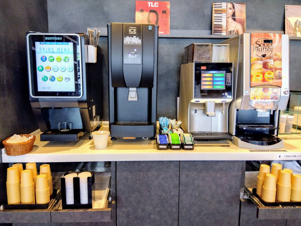 ソフトドリンクのほか、コーヒー・アメリカン・エスプレッソ・カフェラテなど種類豊富なコーヒーバーや、コーンスープ・コンソメスープ・味噌汁なども楽しめます。