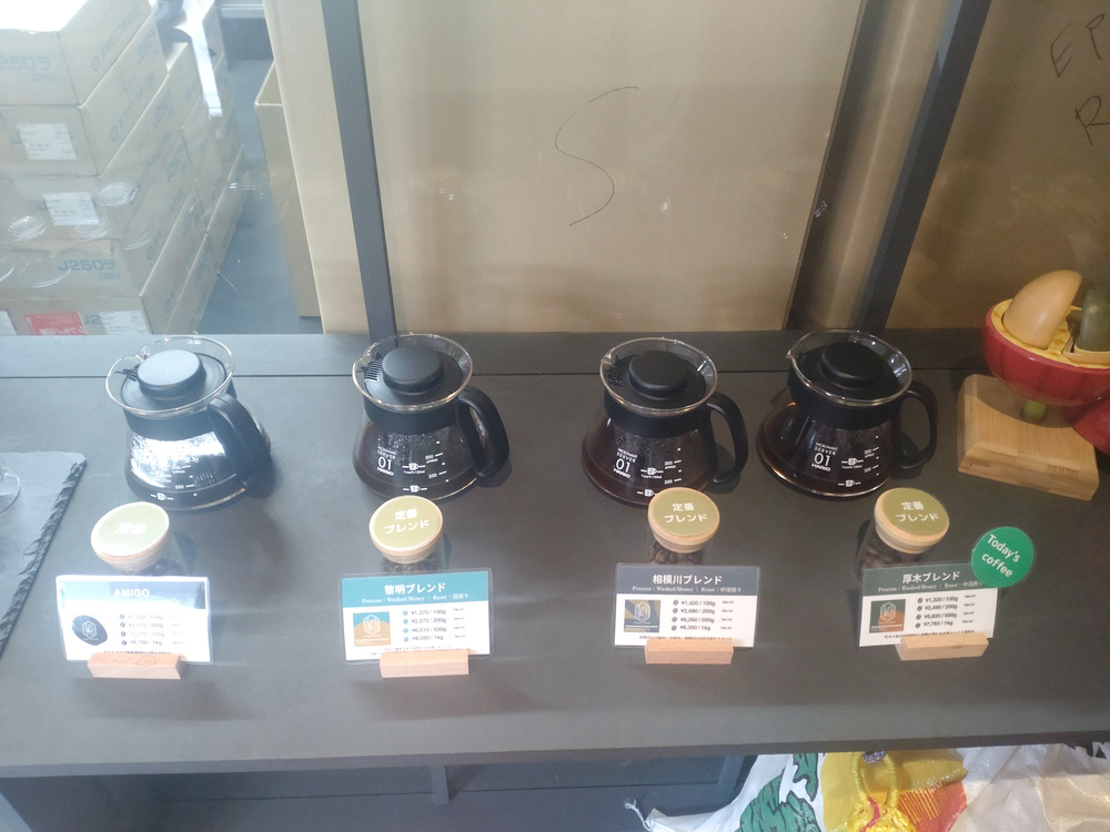 上の写真は定番のブレンドコーヒー4種類。左から「Amigo」、「黎明ブレンド」、「相模川ブレンド」、「厚木ブレンド」という名前です。