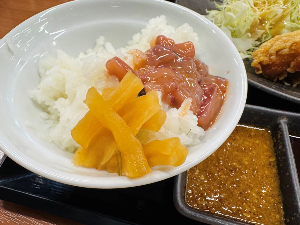 そのままでも十分おいしい唐揚げですが、ぜひ試してほしいのが 、定食に添えられてくる、ゴマとニンニクが香る「極ダレ」。