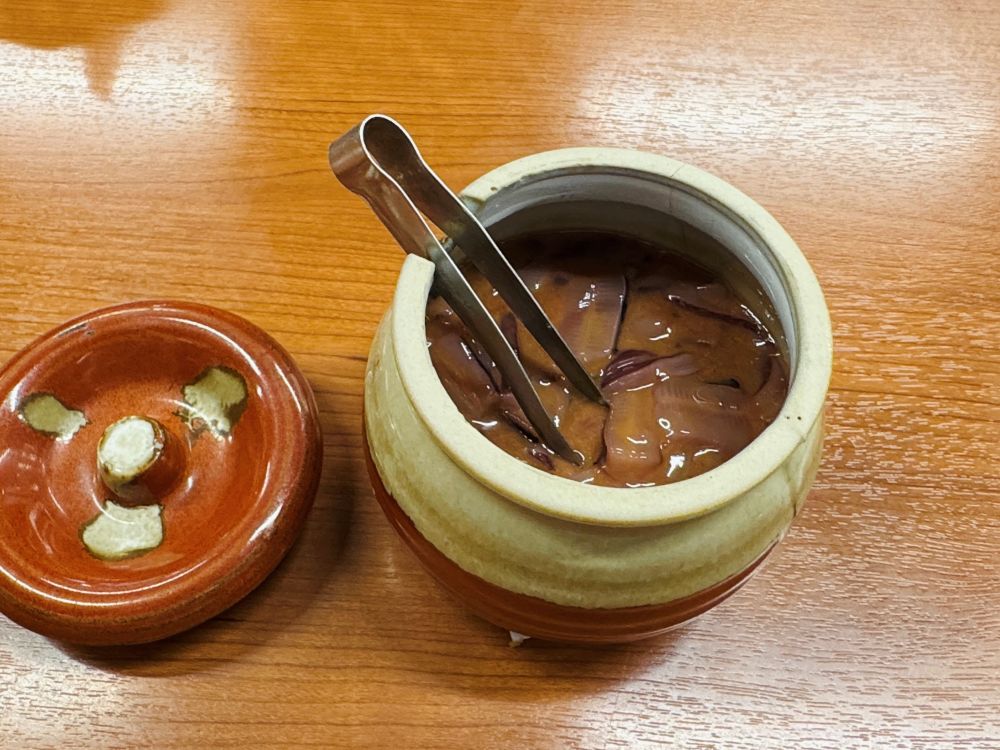 店内で食事をすると、イカの塩辛とお漬物が食べ放題。