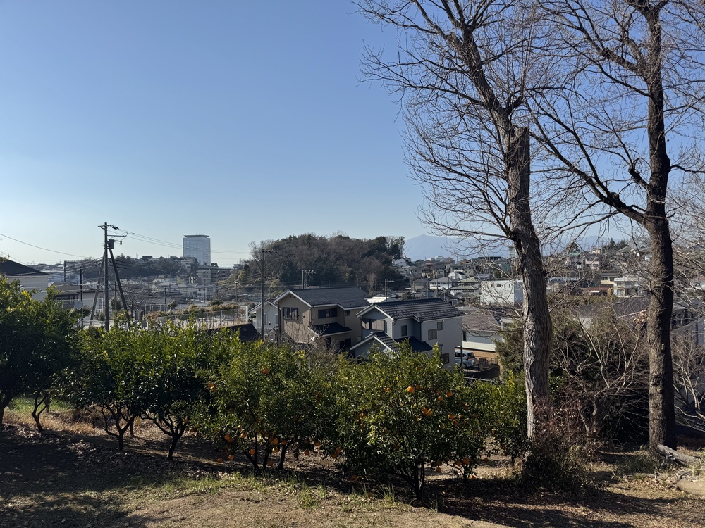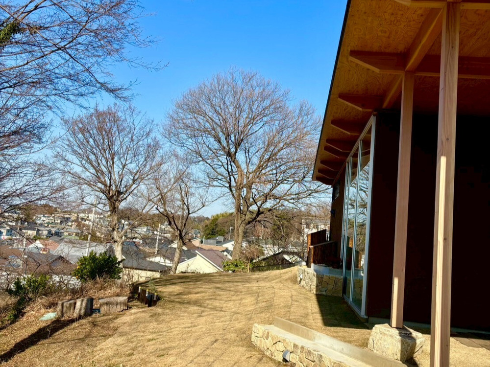 庭に出ると、丘の上から海老名の街の方まで見渡すことができ、里山と市街地がゆるやかにつながる景色が広がります。