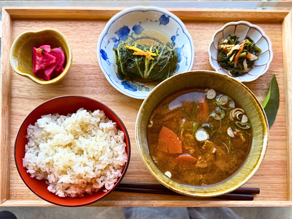 キャベツで包んだ豚バラ、大根のお漬物、小松菜のお浸し、ご飯、そして具沢山の豚汁をいただきました。