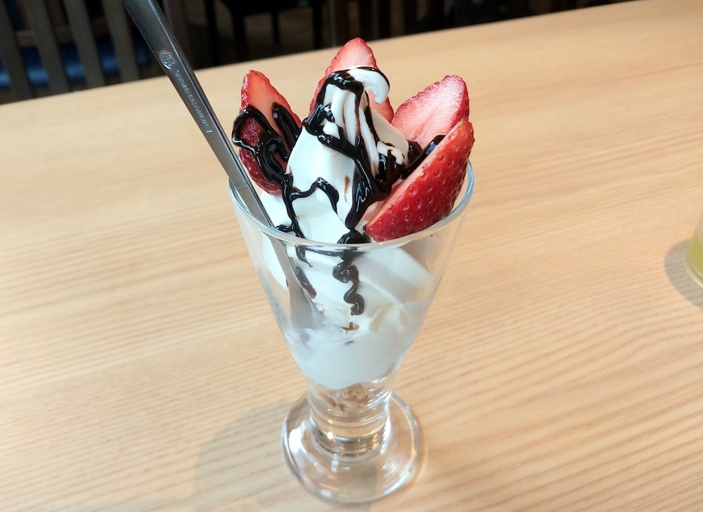 完食後、当初はカップソフトにしようか迷ったのですが「春いちごのミニパフェ(いちご・チョコ・練乳)(税込352円)」のメニューに目を奪われ、こちらを注文。