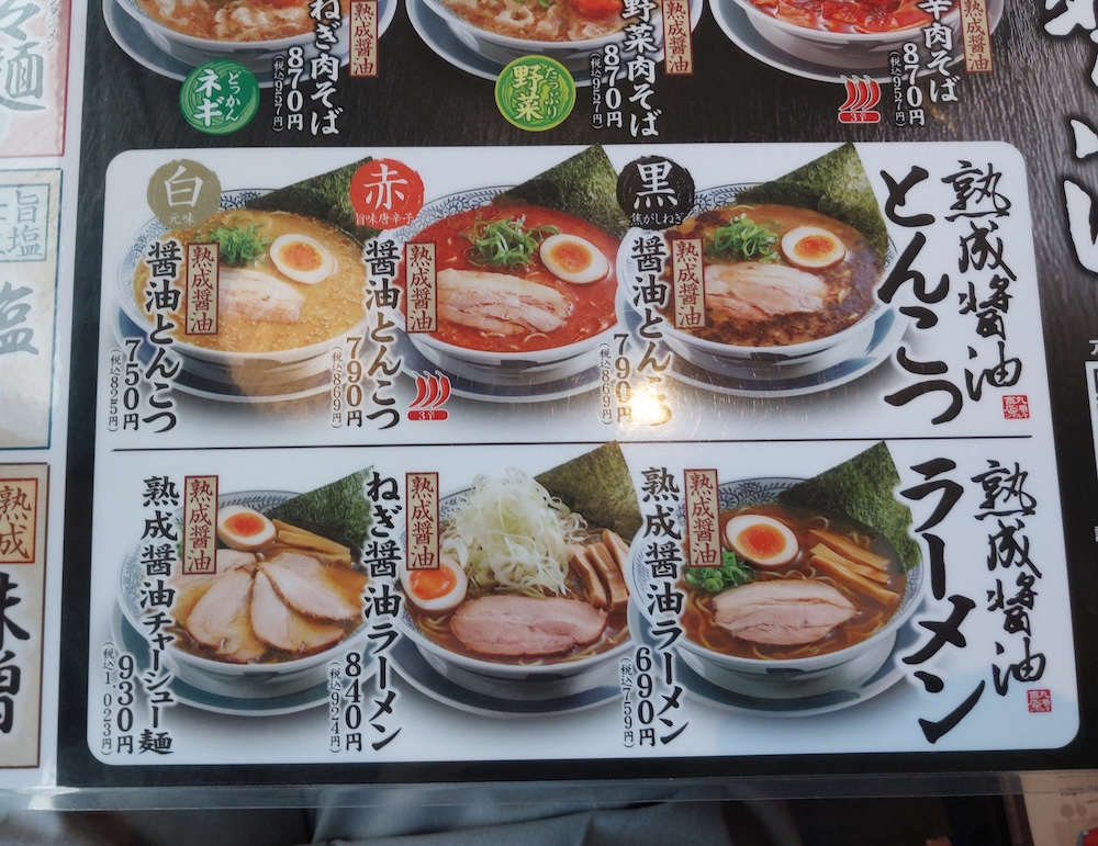 そのほかにも、「熟成醤油ラーメン」や「熟成醤油ラーメン とんこつ(黒・赤・白)」など、バリエーション豊かなラーメンがそろっています。