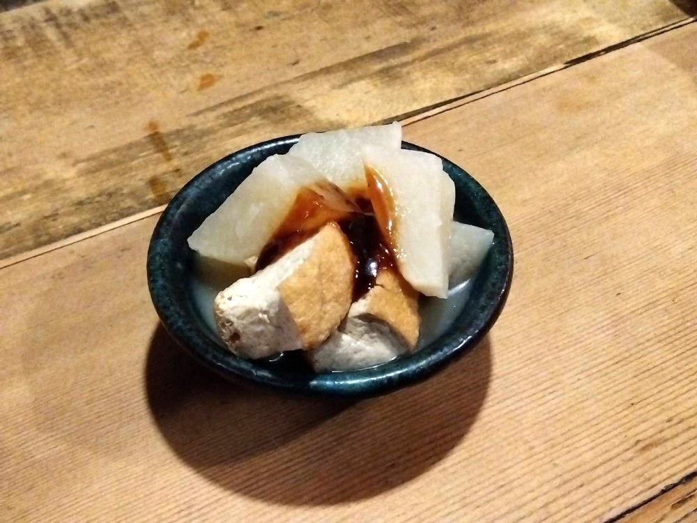 お通しは味噌おでん(330円)。あっさりしたおでんの味つけに、味噌のピリッとした味がよく効いています。