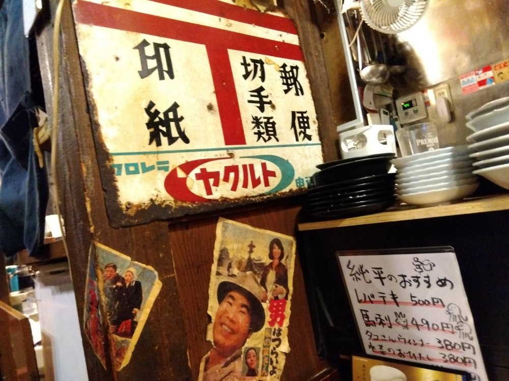 席の目の前に貼られた、サビついた看板やシワシワの張り紙。あの頃は戦後から徐々に成長していく躍動感あふれる時代でしたが、同時にどこか雑多な雰囲気のあった時代。