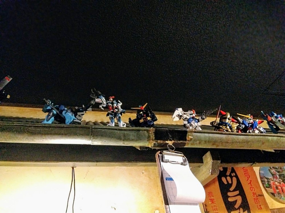 カウンター席の上はトタン屋根となっており、雨樋をのぞくとたくさんのガンプラが並んでいました。