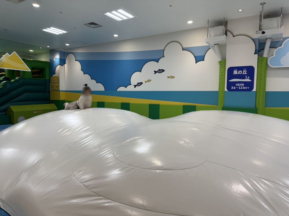 体を思いきり動かして遊びたい子どもたちに人気なのが、丘をイメージしたふわふわの巨大トランポリン「風の丘」です。