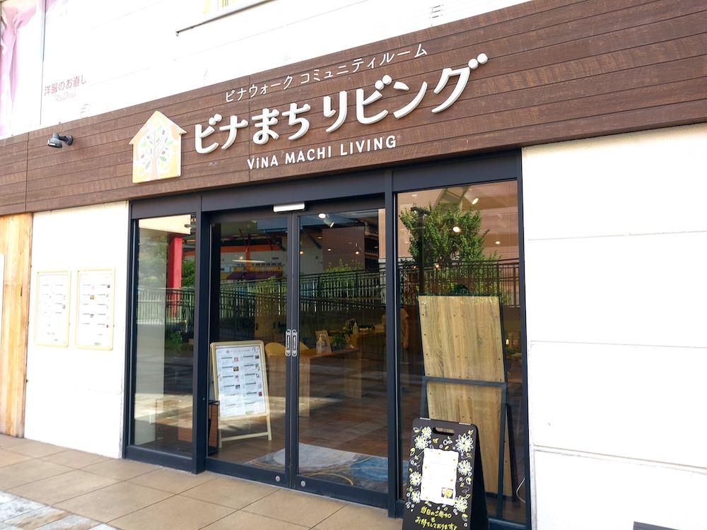 ビナウォーク5番館の「ビナまちリビング」は、海老名駅東口からペデストリアンデッキを中央公園方面へ向かい、スターバックスなどを通り過ぎ、イベントスペース「ビナステップ」を抜けた先の場所にあります。