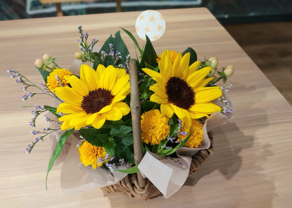 ヒマワリの周りに挿していくと、一気にキュートな印象にしてくれます。
