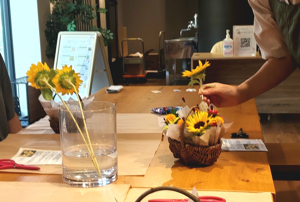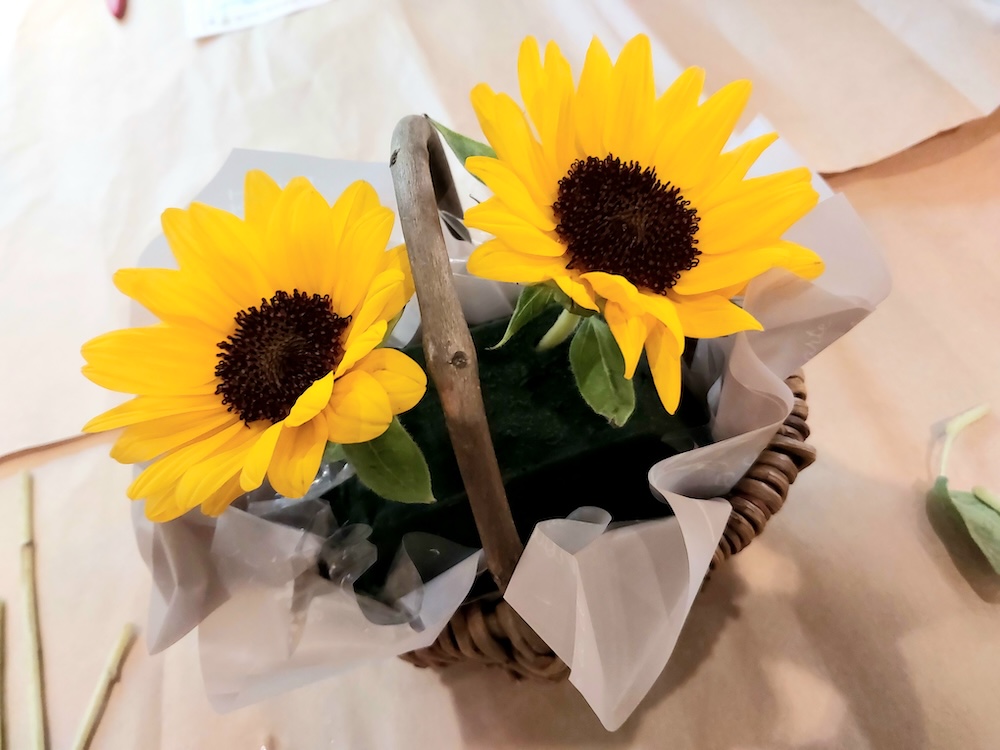 今回のアレンジメントは8月の開催ということもあり、夏らしいヒマワリが主役。フローリストの先生の丁寧な指導のもと、かわいいブラウンのかごに入ったオアシス(給水スポンジ)に花を挿しながら作業を進めました。
