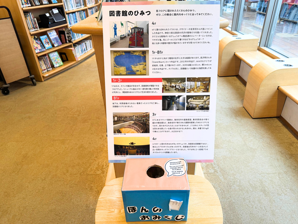 1階入り口カウンター付近にて引くことができ、本にまつわる開運のアドバイスとともに、図書館職員の方が選んだ一冊をおすすめしてくれます。