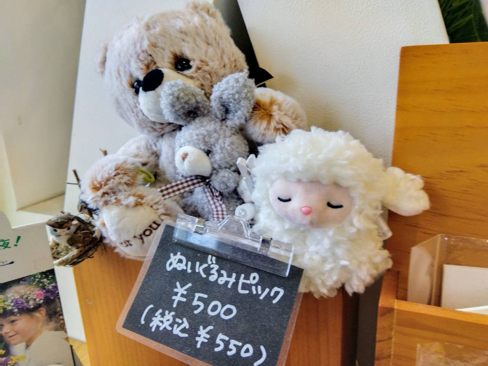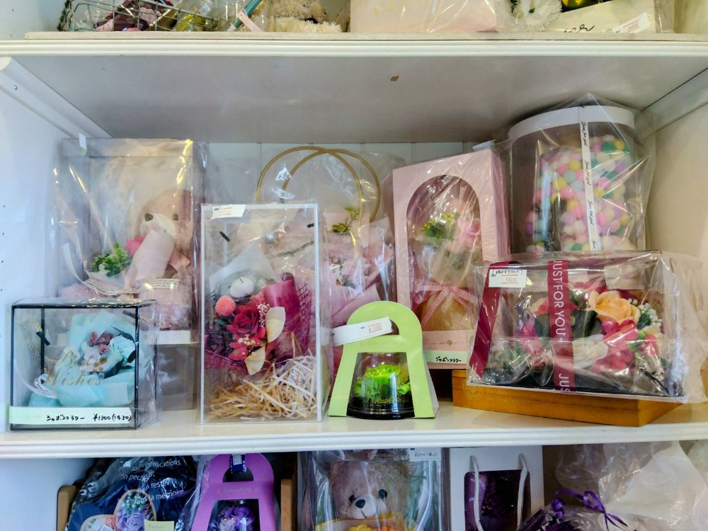 奥の棚には、造花や保存加工された花々がぎっしり。花とぬいぐるみで満たされた、乙心をくすぐるメルヘンチックな光景です。