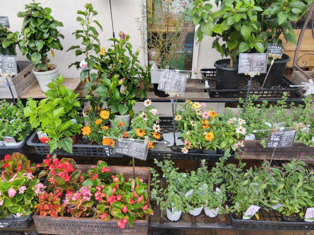 入り口付近は花苗がズラリと並んでいます。車が行き交うアスファルトの隅で、草花が生い茂る外観が印象的です。